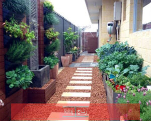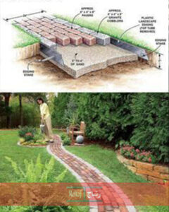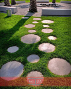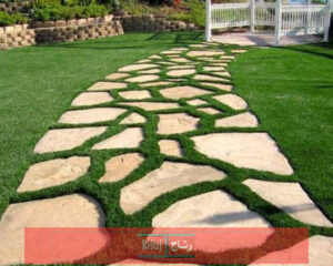 و من الممكن القيام برص البلاطات أو الحجارة بالقرب من بعضها بحيث تكون المسافة بينها ضيقة حوالى (5 – 7 سنتيمتر فقط) ، لزرع نباتات الحشائش فى تلك المسافات الضيقة ، و تكون الأحجار و البلاطات فى مستوى أعلى من مستوى المسطح الأخضر لتجنب تغطيتها بمياه الرى .