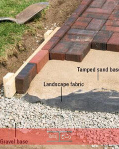 بشرط أن تكون قوالب الطوب خشنة الملمس و تكون محروقة جيدا لتتحمل المشى عليها و لتتحمل أيضا العوامل الجوية ، و للمساعدة فى تثبيت هذه القوالب توضع القليل من مونة الأسمنت فى أسفل هذه القوالب و فى الفراغات بينها و بين بعضها ، و هناك بديل رائع للطوب الأحمر و هو طوب القرميد ذو الألوان الزاهية و الذى يعطى مظهرا أكثر جمالا .